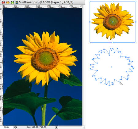 Figure 6. Left: The original Sunflower.psd image from Photoshop’s Samples folder. Middle top: Same image, after creating a clipping path around the flower and placing it into InDesign. Middle bottom: The clipping path converted to a standalone frame in InDesign (via Object > Clipping Path > Convert Clipping Path to Frame).
