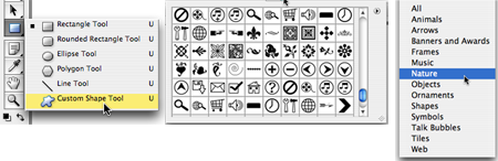 Figure 7. To access the Custom Shape libraries in Photoshop, you need to first select the Custom Shape tool: the blobby one that’s revealed when you press and hold on the default Rectangle tool (left). Now you’ll see a menu icon labeled “Shape:” in the Options bar. Click it to reveal the library of custom shapes (middle) that you can choose from. To see more shapes, select a collection from the library’s fly-out menu (at right, a portion of this menu).