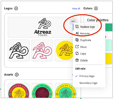 Pro Tip: If you ever need to update a logo image, click the More Options icon (three dots) next to the current image, choose Replace Logo, and upload the new file (Figure 3). This will automatically update all your Adobe Express designs.