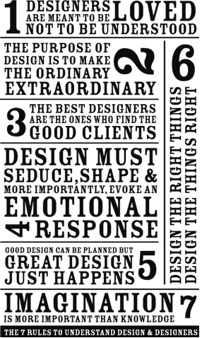 When you want to wear your heart on your sleeve — or rather, your philosophy on your wall — display the vinyl graphic “7 rules to understand design & designers.” It’s available from the French home decor site Harmonie interieure in nine colors and two sizes: 70 x 120 cm (27″ x 47″) for 129€, and 50 x 80 cm (20″ x 33″) for 69€. Shipping costs are as follows:
