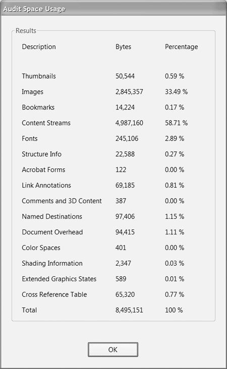 Depending on the document’s contents, you see listings for such elements as fonts, comments and images; each is defined both in percentages of the entire document size and in bytes. Click OK.