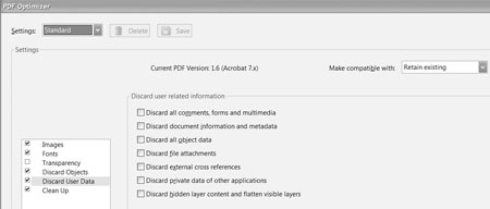 • Discard User Data. Decide which objects can be removed from the document, such as layers, form content, cross-references and comments. Some of the options from the Examine Document dialog are included in this panel.