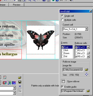 We were especially impressed with SmartSaver Pro’s new JavaScript functions. In addition to simple rollovers, you can now create one-to-many, distance, and audio rollover effects. For example, a mouse-over action on one cell can trigger multiple events, including replacing the current cell with a GIF animation, replacing a non-contiguous cell with a new image, and playing an audio file.