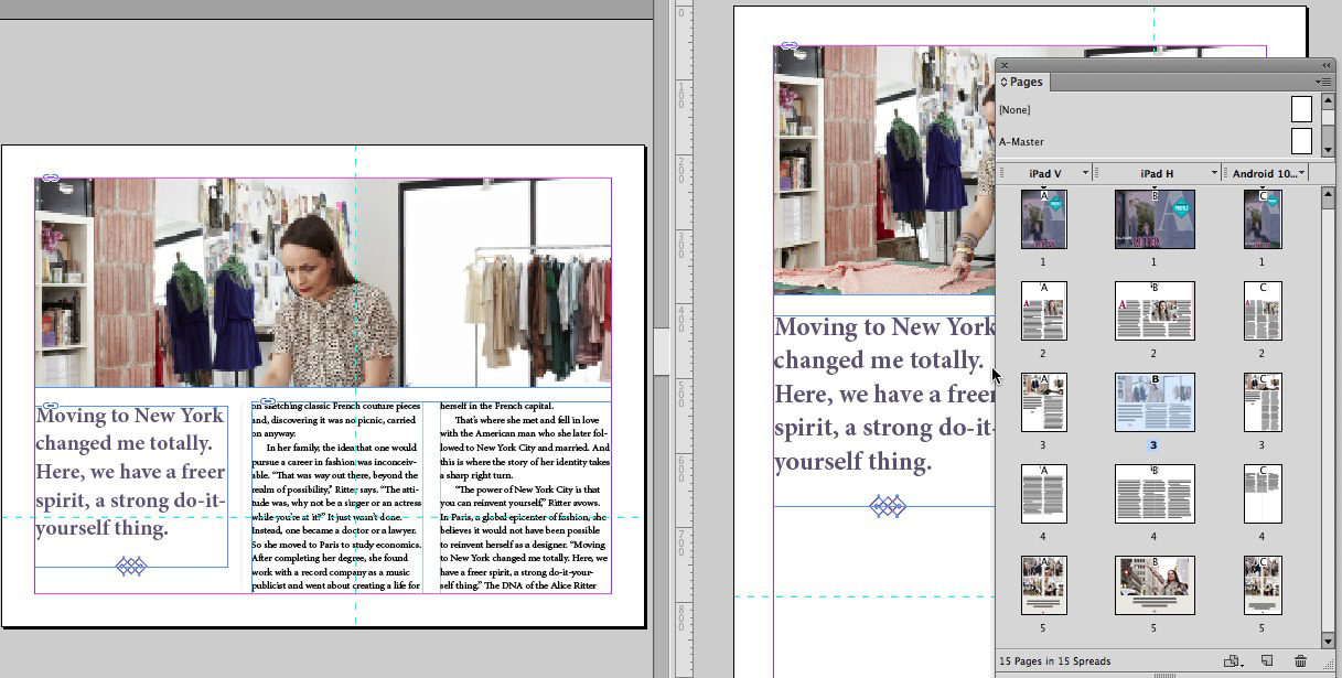 InDesign CS6 introduced the Alternate Layout feature to include multiple layouts within the same InDesign document. Primarily designed for the layout of pages for tablet apps, which can have multiple sizes and orientations, it can be used for other uses as well. Here is an example with three alternate layouts: