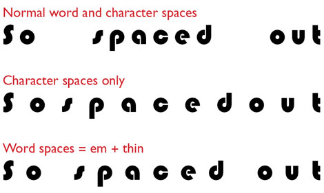 Again, because fixed spaces can’t be stretched, they’ll be narrower than the artificially expanded spaces. Once your spacing is close to correct, you can hand-kern the spaces to get them just so.