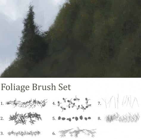 This set of 8 brushes from dierat can add foliage texture to a Photoshop painting. The brushes were made from photos of trees, bushes, and grass (except number 8, which is painted).