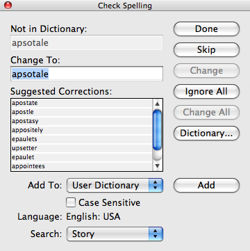 Another lesson we should all remember is that human error can creep in, even when Check Spelling is trying to do the right thing. Take, for example, the recent example of The Daily Universe, the student paper at Brigham Young University in Utah. Basically, a student editor ran a spell-check in InDesign, found a misspelling (“apsotale”), and replaced it with the first suggestion InDesign offered: “apostate” rather than the second (correct) suggestion “apostle.” While the words are similar, they mean very, very different things.