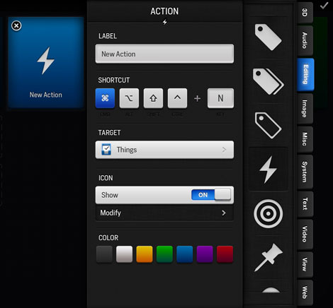 Actions is a new app for iPad that aims to help you navigate complex Mac and Windows applications by putting just the tools and commands you want at your fingertips, via buttons you can customize with colors, labels, and icons. In effect, your iPad becomes a customizable remote control for any application. If you have a common set of tasks that you have to perform in sequence, you can order the buttons to match that workflow.