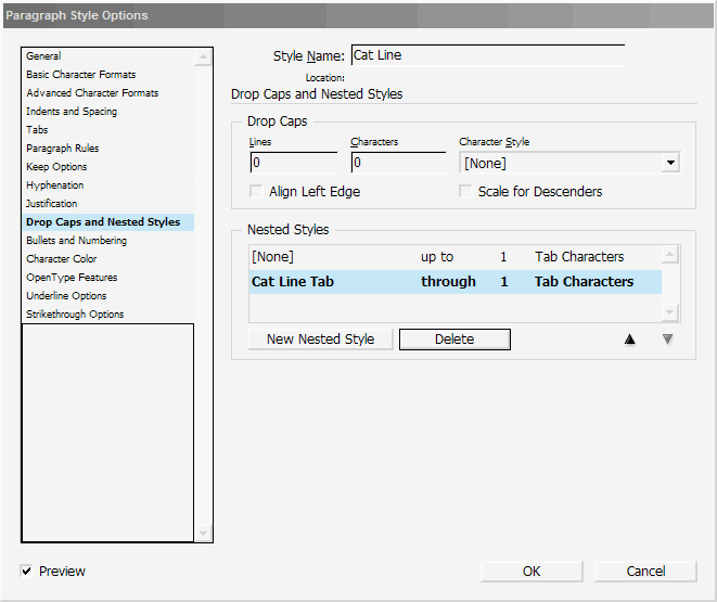 - Now, double-click on the paragraph style in the Paragraph Styles palette/panel to open the Paragraph Style Options dialog. Go down to the Drop Caps and Nested Styles pane (see Figure 2). Make sure the Preview box in the bottom-left of the dialog is checked; we want to monitor the changes we make to the paragraph style options on live text.