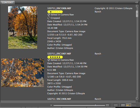The Content panel displying thumbnails, ratings, and other metadata for images.