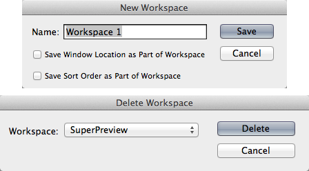 To delete a workspace, just switch to another, then select the one you want to delete (custom workspaces only) from the list in the Delete Workspace dialog box. If you modify a workspace and want to replace a workspace with your modified version, name a new workspace with exactly the same name as the one you’re replacing and Bridge will let you overwrite the original workspace.