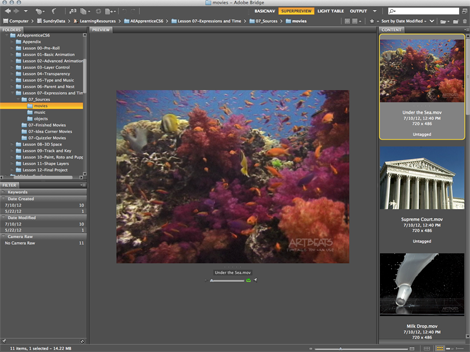 By using the slider at the bottom of the window to shrink and enlarge your thumbnails, you should be able to easily select your files without needing the Preview panel, giving you more room for the Content panel. However, even if you’re only selecting a file to drag into Photoshop or another application, you still may want to be able to view that file’s metadata or filter on one of its attributes (label, rating, keywords, etc.), in order to narrow your choice between, say, very similar images or different versions of the same document. By keeping the Metadata and Filter panels in your browsing workspace, you’ll always have quick access to that extra information, although if you usually prefer to use the Details list view, (chosen from the bottom right of the window), you may not need the Metadata panel open for basic browsing tasks.