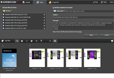 Do you want an easy way to share proofs and large files with clients without worrying about e-mail attachment limits or walking clients through the process of using your FTP server? Every free Acrobat.com membership includes 5GB of file storage (see below). You can access your own files again from any Web browser, but more importantly, you can also instantly share any uploaded document with others. Although there are file-sharing services out there with larger capacities and more advanced versioning, it’s the clean and intuitive user interface, as well as the tight integration with the other Acrobat.com services that puts the free My Files and Share services top of my list.