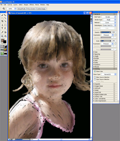 Another feature that has been dramatically improved is Painter’s popular cloning functionality. This lets you trace over an existing photo or image with Painter’s brushes, resulting in a new painting that derives its color and lines from the original, with stylized paint strokes that conform to the style, paper grain, and stroke direction of the brushes and materials you choose (see Figure 3). If your assignment is to quickly produce illustrations that resemble a photograph in a painterly style, there is no more efficient tool. In Painter IX, this feature is much easier to use — you simply select the Quick Clone menu item, and choose a brush, before you go to work cloning an image.