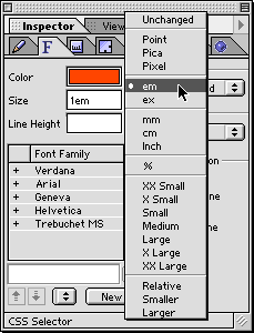 Relative forms of measurement allow for the specified object to size or position depending on the viewer’s browser and system settings, allowing you to specify a style you like but letting the viewer adjust the type size through the browser’s controls. Relative forms include em, ex, percentage, and smaller/larger. For type mavens, the “em” unit seems to be the up-and-coming favorite. “Em” is based on the width of the “m” character of the font face specified.