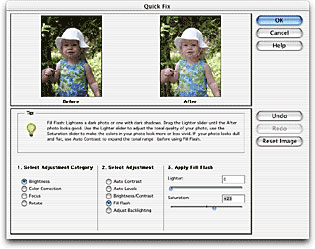 Color correcting and enhancing a photo can be a rather challenging and daunting task to first-time users of an imaging application. Elements 2.0 adds a handful of new commands (and improves upon some others) that takes the guesswork out of fixing photos — and makes it almost fun, or at the very least easy to do so. The AutoFix command does a great job at consolidating all the available adjustment commands into one, uncomplicated dialog box (see figure 7.0). Simply choose an adjustment category, select an adjustment, and apply any settings. Numbered steps are minimal, making it obvious what to do next. Dialog tips change depending on the options selected and multiple adjustments can be applied and undone without leaving the AutoFix dialog box.