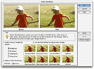 The Color Variations command offers an intuitive method to interactively choose from a series of thumbnails until you reach the right levels of color and brightness (see figure 8). This dialog box also includes dialog tips and the ability to undo multiple decisions.