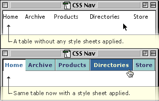 Three simple CSS classes manage all the rollover states for your svelte new buttons. - Create the table that will house your CSS buttons. It can be a column of vertical cells for a sidebar navigation or a long row of horizontal cells for a global menu system, as in this example.