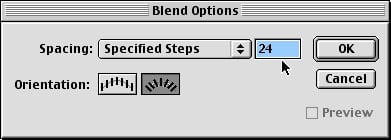 Figure 2: For number of steps, use 12 or its multipliers, in this case 24. - With the Blend tool still selected, click within your first shape and then click within the other shape. This creates a live blend with the options you just set. The blend is dynamically defined between the two shapes using a special type of path known as a spine (Figure 3). Switch to Outline view (View>Outline) to see the spine more clearly. The spine can be edited into a curve or any other shape (Figure 4).