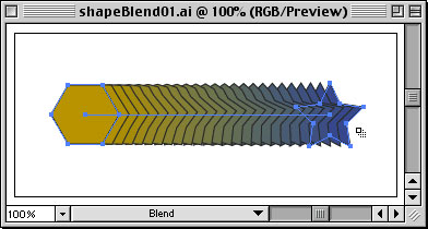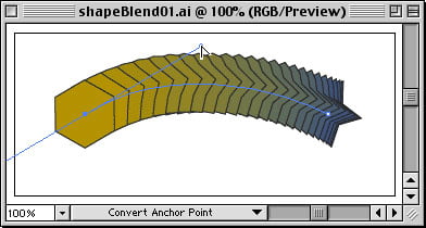 Figure 4: The blend spine can be adjusted to change the blend dynamically. - Switch back to Preview view (View > Preview) and save your document in its native format and version if you have not already. This will be your editable version. Do this because the steps that follow will eliminate the ability to edit your live blend, so we’ll make a quasi-export document from this point on.