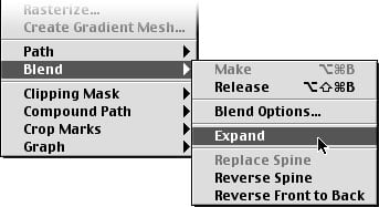- With your blend selected choose Object>Blend>Expand from the main menu (Figure 5). This converts the live blend into basic objects, losing the dynamic capabilities but making it possible for the blend to be imported into LiveMotion (Figure 6).