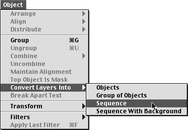 Figure 8: Found under the Object menu, Convert Layers Into>Sequence breaks each layer into a frame.