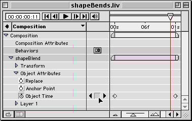 Chances are you will want to tweak the timing or fine-tune other attributes of your newly created shape tween animation. Timing controls can be located under the Object Time attribute. The thing to keep in mind is your shape blend sequence can now be treated just like any other object in LiveMotion, so don’t feel that you have to stop at just a simple shape tween. You can adjust and add other attributes to make the shape tween even more interesting.