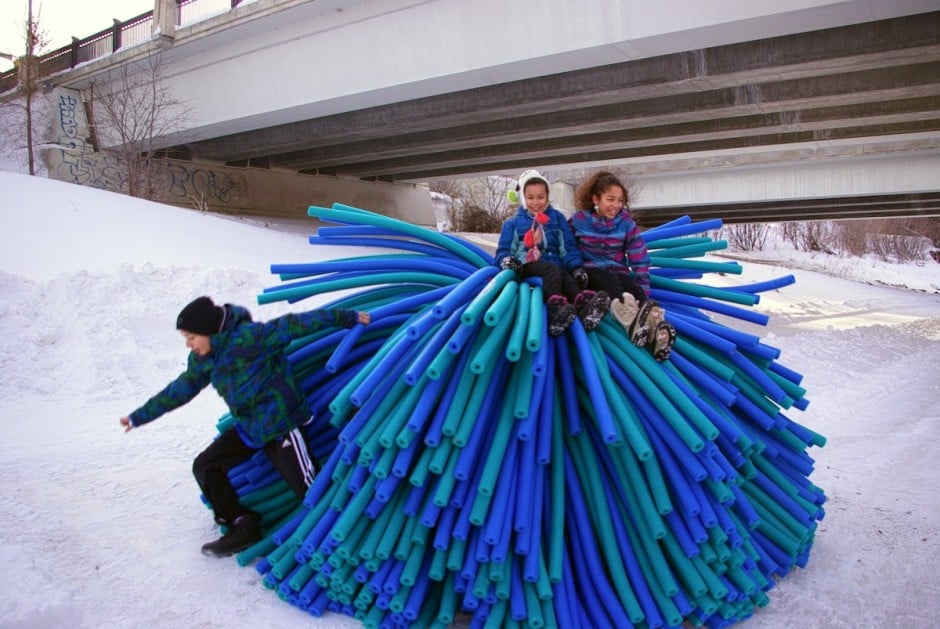 8. Take a heater, some lights, an aluminum frame, and few hundred pool noodles, and what do you get? Ginormous Koosh balls called Nuzzles, that actually function as fun warming huts on the Red River Mutual Trail in Winnipeg. Actually, the Nuzzles are just one entry in the Warming Huts v.2014: An Art + Architecture Competition on Ice. Check out warminghuts.com to see the other creative entries.