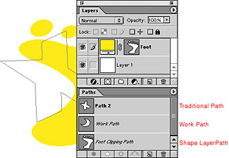 There are several different types of vector shapes in Photoshop 6. There are the traditional paths that appear in the Paths palette. There are also the paths that are part of the new Shape Layers. These paths appear in both the Layers palette as clipping elements and in the Paths palette. All of the Path tools — rectangle, round corner rectangle, ellipse, polygon, line, custom shape, and pen — can create either Shape Layers or Work Paths (as shown in Figure 1). You use the Options bar at the top of the screen to choose between the two (Figure 2).
