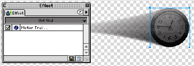 One of the reasons I particularly like working in Fireworks is the ability to edit filter effects after they have been applied. This means that once you apply a blur, sharpen, or third-party filter you can go back later and change the settings for the effect. For instance, start by applying Motion Trail (my favorite!) from the three Eye Candy filters that are included with Fireworks 4. You simply select the bitmap image, and choose Motion Trail from the Effects palette (see figure 1). The Motion Trail effect is applied to the image as a live effect (we’ll go back and edit it later, just be patient).