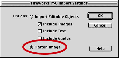 Figure 2: The Fireworks PNG Import Settings dialog box lets you control how files are imported into Flash. Check the Flatten Image option.