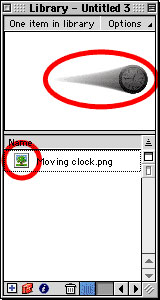 The correct choice, Flatten Image, is the least obvious. Flatten image in most other contexts means you lose any transparency applied to the file — exactly what we don’t want to happen. However, Flatten Image in Flash doesn’t apply to the transparency of the file. What it does is merge all the various Fireworks elements into a single bitmap image while maintaining all its transparency and effects. In our example here, the clock appears in Flash as a bitmap object with the effect in place and the transparency active. It also appears in the Flash Library as a bitmap object (see figure 3).