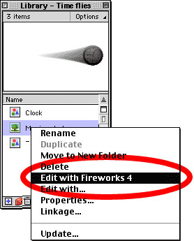 With the bitmap object defined as a symbol, you can easily use it in any sort of motion tween. However, the real benefit of using Fireworks comes if you need to edit the bitmap object. Let’s say we want to change the appearance of the Motion Trail effect so that instead of the trail covering the face of the clock, the trail appears behind the clock. (Remember, this is possible because effects in Fireworks remain editable even after they are applied.) Go to the Library panel and Right-click (Windows) or Control-click (Macintosh) the name of the bitmap object. A context sensitive menu appears which contains the command to Edit in Fireworks (see figure 5).