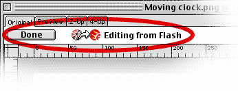 When you choose the command to edit the bitmap object, Fireworks is automatically launched and the original PNG file is opened. Notice, though, that you are in a special session of Fireworks. Instead of the ordinary Fireworks window, the Editing from Flash icons appear at the top of the window. Make whatever changes you want to the image. Then click the Done button. This returns you back to Flash where the bitmap object as well as the graphic symbol are automatically updated.