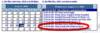 Figure 2: The System Restore calendar and list shows exactly what changes have been made to the operating system. Click to go back to a checkpoint that existed before any problems were discovered. Here, for instance, I can revert back to the last clean install I had of the computer with my Adobe products active but not the Microsoft Works products.