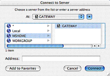 I was concerned about how to move my screen shots from the Windows PC over to my Mac on which I do all my production work. But all I had to do was run the Windows Networking Wizard (yuck, I hate that term, Wizard) and Windows set up my machine so that it would be visible over the network. Then, on the Mac OS X machines I simply chose Go> Connect to Server and the MSHome Network appears (see Figure 4). I can then connect to my Gateway machine as easily as I do to the other Macs on my network. Without OS X, though, this networking wouldn’t be as simple.