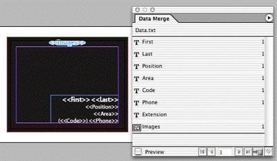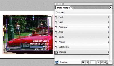 • A Data Merge feature which lets you import database information merged into your InDesign layouts. This is a great feature which makes it easy to create personalize postcards, business cards, letterheads, etc. (see Figure 3). In addition, it allows you to tag image frames so that they automatically fill with individual graphics. Considering that a professional plug-in called InData from Em Software goes for $400, this simple database feature is a great bargain.