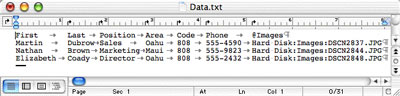 Figure 3: The Data Merge feature lets you set up templates with data fields. (top) These fields are mapped to a tabbed-delimited text file (middle). Finally, the imported data, as well as images, are automatically applied to the layout (bottom).