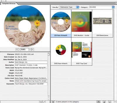 However, for anyone working with templates, the template browser is a terrific feature that makes it easy to manage templates from one central location. This browser also lets you view thumbnails and perform searches based on metadata, including keywords, in each template (see Figure 5). I wish the Illustrator CS team had incorporated such a browser for its template files.