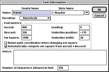 The Font Information box lets you name your new font. Here we to gave a font the family name Travel and then added the weight name Regular, to create the font name Travel-Regular.