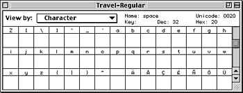 Just because a font can contain up to 256 characters doesn’t mean you have to create them all. Imagine you are working on a travel magazine or book that uses special icons to show hotels, restaurants, parking lots, and bars. Your art director has designed special icons that you would like to use along with the text. Instead of drawing a picture box, importing the icon, and then creating an inline graphic, you can use Fontographer to create a custom font that makes using the icons a breeze.