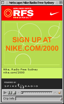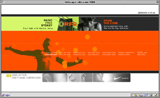 The Ear icon links to Nike’s Radio Free Sydney page, an obvious play on Radio Free Europe that likens the IOC to the organizations that controlled information in the old Iron Curtain countries of Eastern Europe. Where the IOC controls what comes out of the Olympics, Nike presents the real sounds of Sydney — crowd noises, ad hoc interviews, conversations among the athletes, talk in the locker rooms. Remember, this is in-your-face reporting, not the watered-down hyperbole we’re fed on TV.