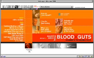 The primary navigation for this site comprises six grayscale images that take on color when rolled over. The images relate to body parts, starting with the Blood + Guts link. The metaphor is perhaps a bit too literal, but Nike’s point is to show real flesh-and-blood athletes rather than to glorify and sanitize the Olympic moment. It’s the equivalent of TV’s “Up Close and Personal” interviews with athletes, but a lot hipper.