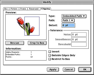 With your graphic still selected and the Modify dialog box still open, click on the Clipping tab. If your graphic contains a clipping path, it will be selected from the Type and Path pop-up menus, as shown in Figure C. Now, click the Crop To Box button and deselect the Restrict To Box check box. Then click OK.