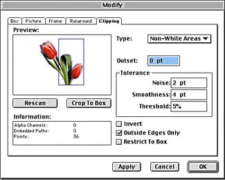 If your graphic doesn’t have an embedded clipping path, your clipping tab will look a little different. Instead of Embedded Path, Item is automatically chosen from the Type pop-up menu. However, if you have a nice white background, such as in our graphic, you can easily generate a clipping path in QuarkXPress.