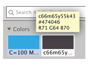 By Bart Van de Wiele Creative Cloud Libraries support RGB, hexadecimal, and CMYK colors. Just remember that a color’s name is not necessarily an indication of its mode. Hover your pointer over a Library item to see the name of the color, its hex value, and the actual color values. In Figure 6, the gray color was originally defined as CMYK but was converted to RGB so it could be used in a Publish Online project. Because the name of the swatch was never changed, you might think it was CMYK, but it isn’t. Notice the actual RGB color values at the bottom of the yellow pop-up.Â