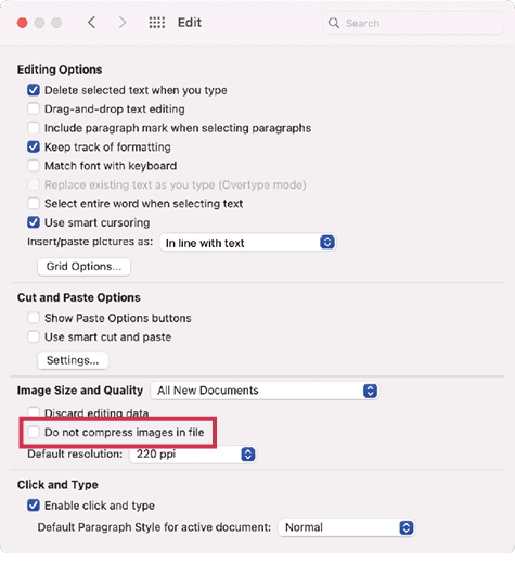 By Julie Shaffer Have you ever placed a Word file into InDesign only to see that all the anchored images came in as embedded images with low resolution? What’s going on here? By default, Word compresses images to 220 ppi at their size in your document. That resampling might keep the overall file size small, but it doesn’t always translate well into InDesign, especially when we need to use the images for print production.