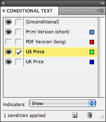 The end result is that you can then use the Show/Hide icons (the eyeballs next to each condition) to show and hide text with that conditioned applied. Hide all the UK conditions, and the US version of the document is ready to be printed or PDF’d. To create the UK version of the document, hide the US condition(s). Coolness.