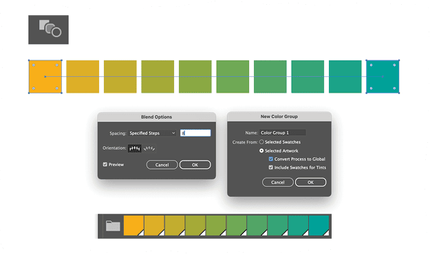 For an old school approach to creating color palettes, use the Blend tool. Create your start and end colors, apply them to simple objects, then create a stepped blend between them. I kept it simple. When you’re happy with the result, duplicate the blend object and choose Object > Blend > Expand to convert it to individual shapes, from which you can create a Color Group. Reuse the original blend object to repeat the blending process with different sets of colors to create multiple palettes.