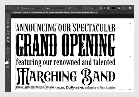 To create text that’s dynamically sized to fit its container, take the Type tool and in the Options bar, click the Toggle Dynamic Text button. Dynamic text often looks best if you apply all caps, but feel free to experiment with different fonts. To control the size of dynamic text, manually insert returns to separate the text into paragraphs. The shorter the line of text, the larger the characters will be.
